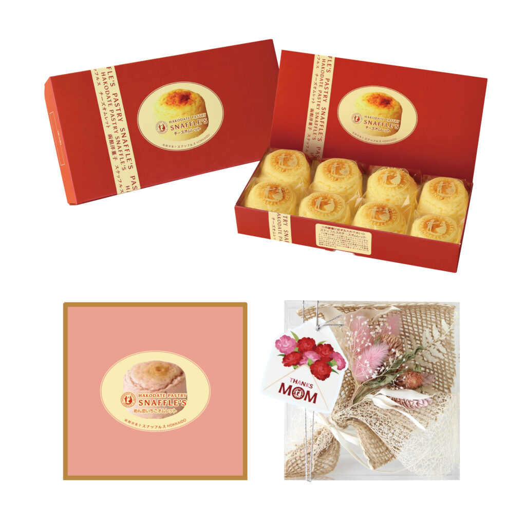 【内容】チーズオムレット8個入×1箱・めん恋いちごオムレット4個入×1箱・ドライフラワーブーケ1個