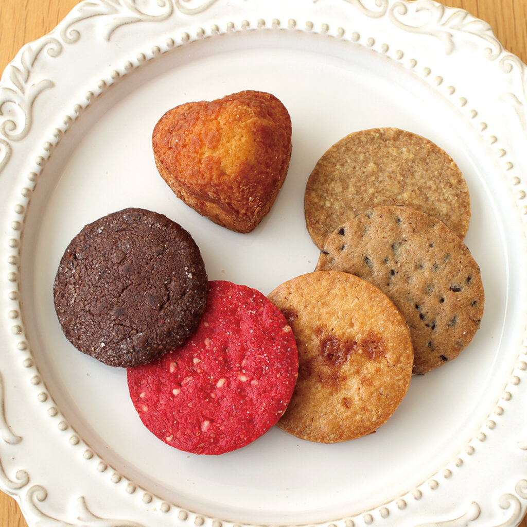 メイプルシュガーのやさしい甘さのマドレーヌ「ボナペティ」や、自慢のクッキー5種を詰め合わせたホワイトデー限定ギフト。花柄の帯が春らしさを演出しています。